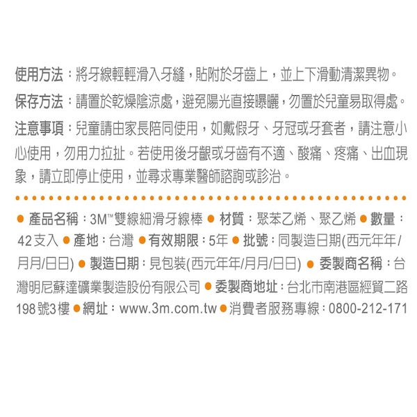 ◆品 名:3M雙線細滑牙線棒42支(散裝)